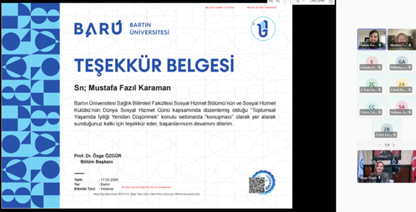 Department Head Prof. Dr. Özge Özgür stated that social work is a professional discipline, but it is vital that it be practiced without losing touch with local values. Hakan Karaman, on the other hand, brought the subject to a historical perspective with examples from Ottoman foundation traditions. At the end of the event, Mustafa Fazıl Karaman was presented with a digital certificate of appreciation. The program concluded with contributions and questions from the participants.